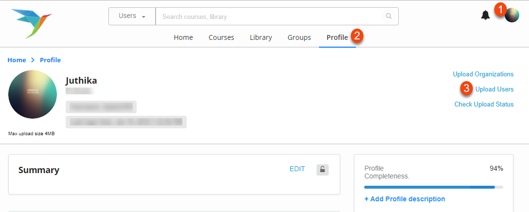 | 1. You are logged in 2. You are currently on Profile page. You want to upload users 3. You have clicked on Upload Users Note: Ensure that the administrator of your organization has assigned user roles on the portal. For details on how to assign user roles, refer Assigning User Roles |